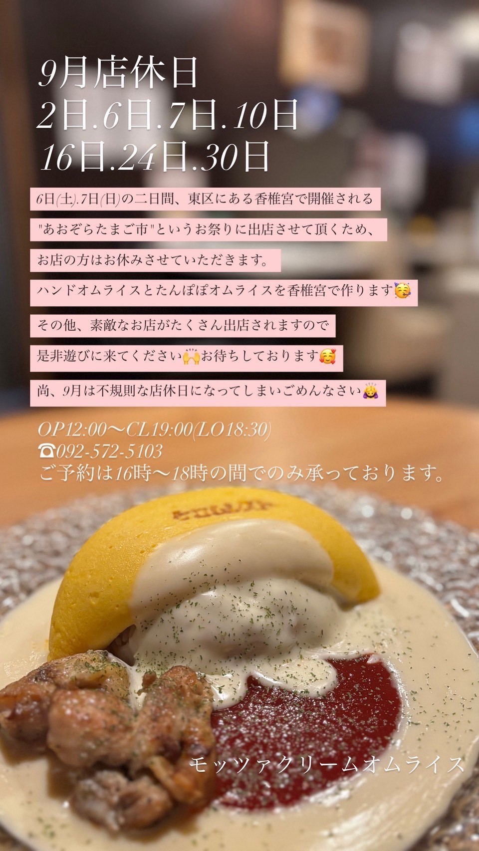 9月の店休日は2日.6日.7日.10日.16日.24日.30日となります。open 12:00~close 19:00(lo 18:30)ご予約...